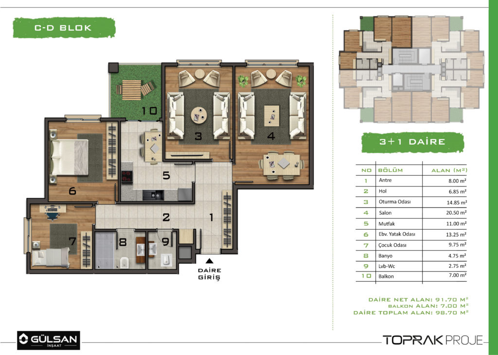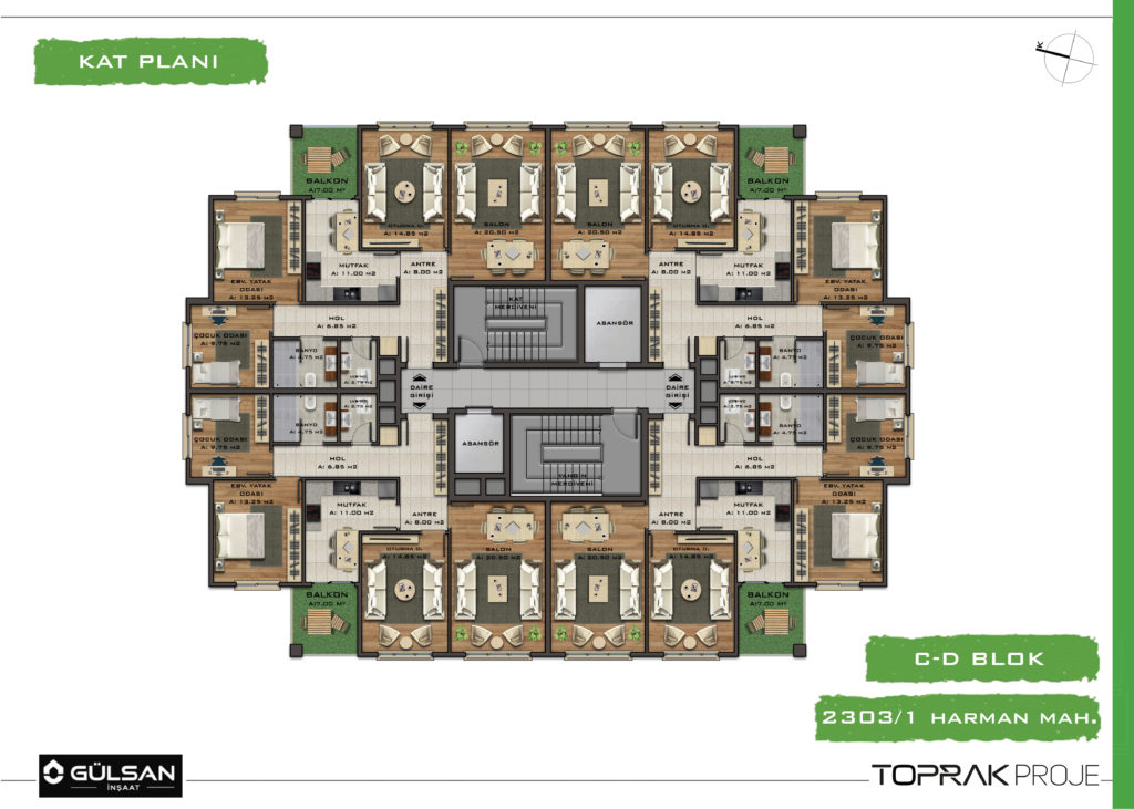 • C Blok 3+1, Brüt 135 m², 37 Daire- 3 Dükkan